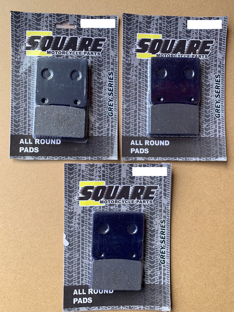 Im Set sind die Bremsbeläge für die vordere linke, vordere rechte und hintere Bremsscheibe enthalten.