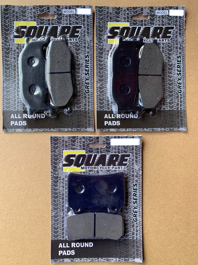 Im Set sind die Bremsbeläge für die vordere linke, vordere rechte und hintere Bremsscheibe enthalten.