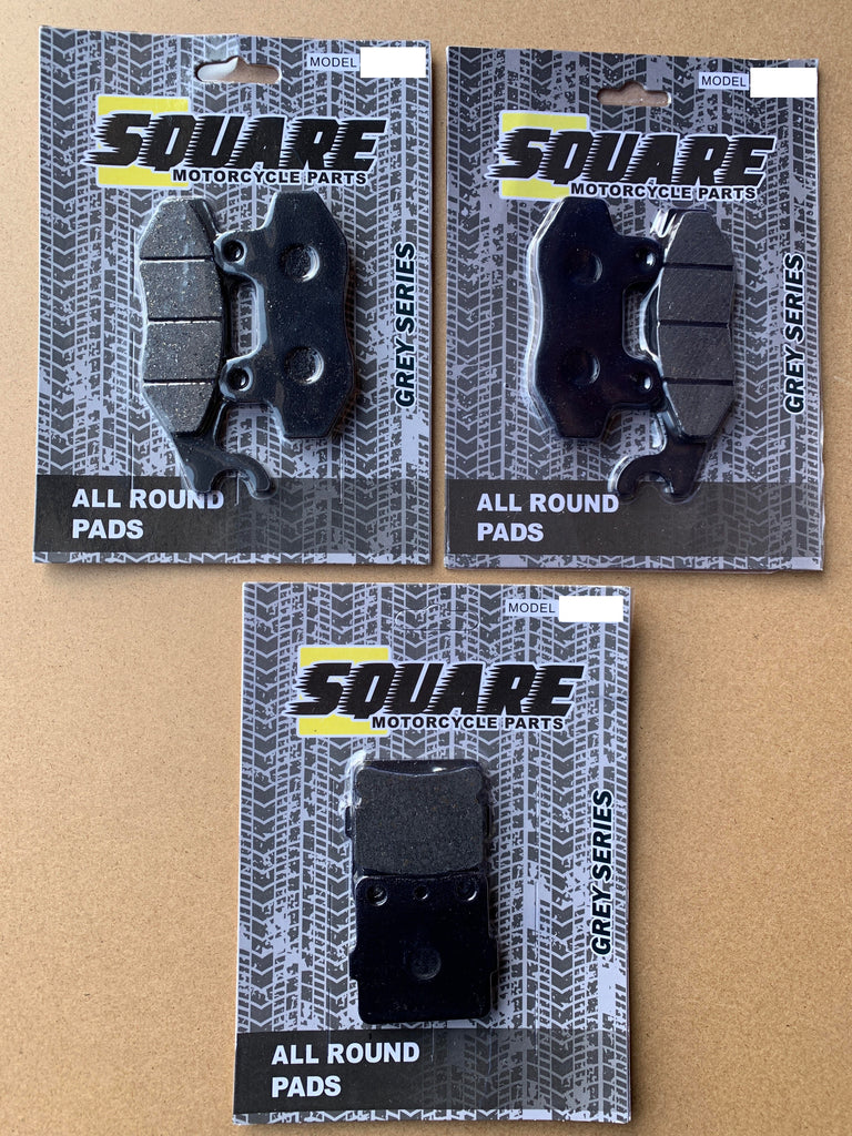 Im Set sind die Bremsbeläge für die vordere linke, vordere rechte und hintere Bremsscheibe enthalten.