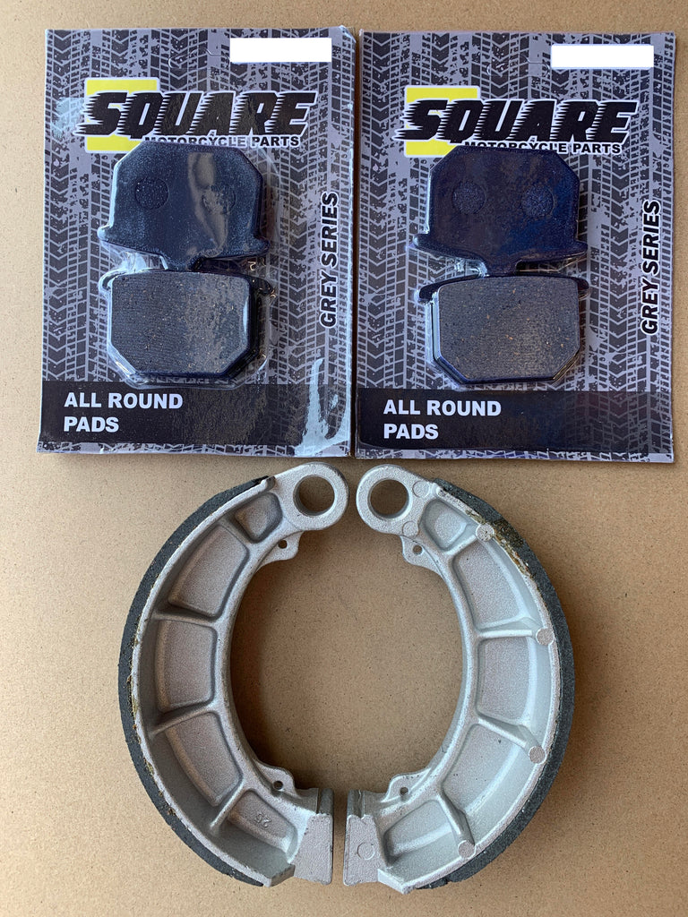 Dieser Satz vorderer Bremsbeläge und hinterer Bremstrommelbacken wurde hergestellt, um die Originalbremssätze eines Honda CX500 zu ersetzen. für die oben gezeigten Baujahre und Modelle.