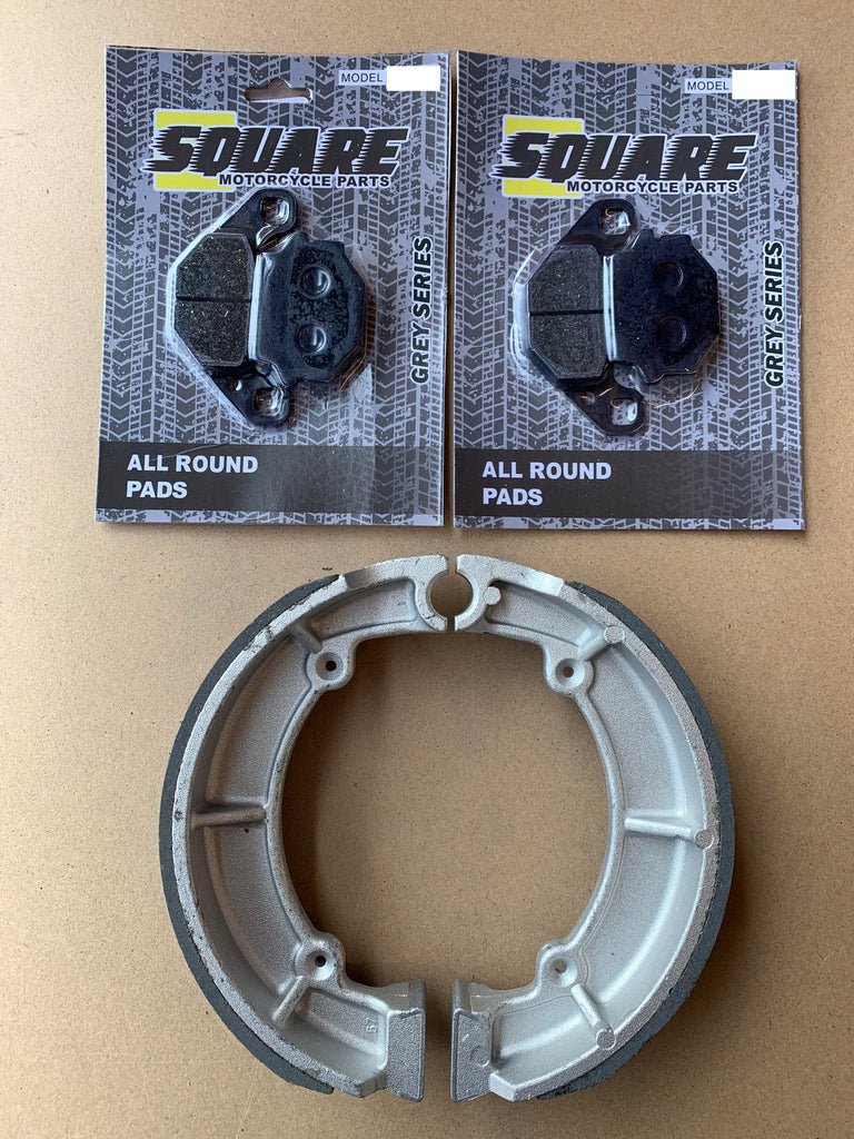 Dieser Satz vorderer Bremsbeläge und hinterer Bremstrommelbacken wurde als Ersatz für die Originalbremssätze einer Kawasaki GT550 für die oben gezeigten Baujahre und Modelle hergestellt.